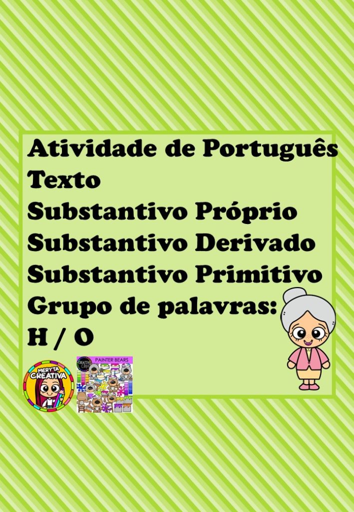 Atividade de substantivos de hoje tenho texto do Monteiro Lobato contando como é o sítio do pica-pau amarelo e os personagens que moram nele. Aproveitando o texto retirei os substantivos próprios . Além desse texto temos atividade de substantivo primitivo e derivados atividade para achar No No diagrama atividade para formar frase atividade para achar o primitivo o substantivo primitivo e também para achar o substantivo derivado de cada palavra. Sem esquecer do grupo de palavras comecei pela letra h porque tem muita criança que tem dificuldade de palavras escrita com O e palavras escrita com h. Tem também a folha do ditado de um lado as palavras ditas pela professora e do outro caso a criança erre a professora faça a correção. Pra escrever no seu caderno a palavra correta.