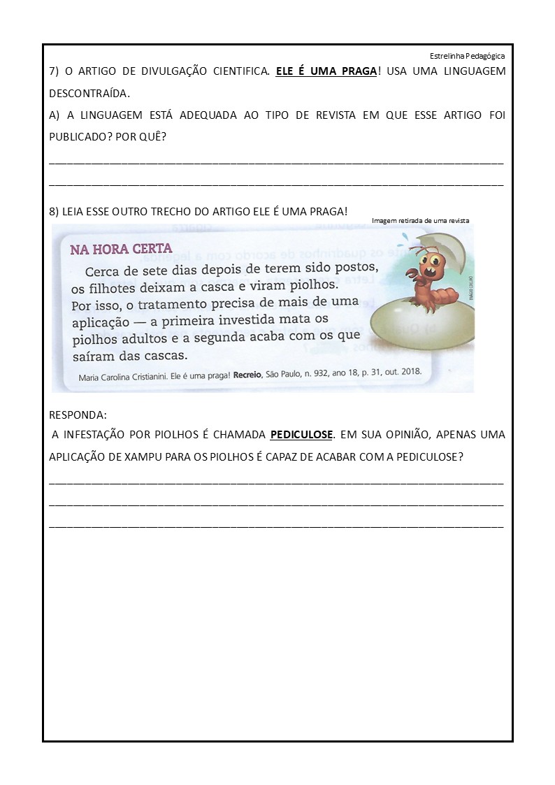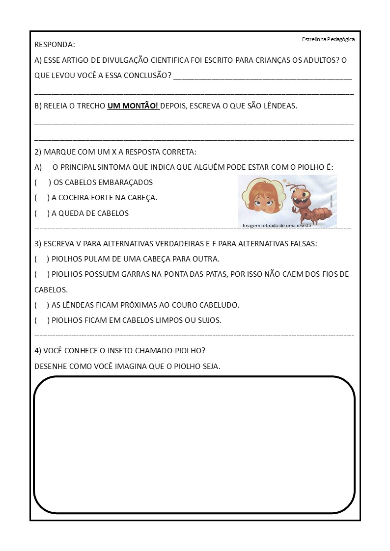 Apesar de comuns, esses problemas podem trazer grande desconforto para as crianças e preocupação para pais, responsáveis e educadores. Por isso, é essencial manter uma postura informada, preventiva e acolhedora diante dessas situações. Pensando nisso, o blog Estrelinha Pedagógica preparou uma atividade gratuita e educativa para ser trabalhada com os alunos em sala de aula ou em casa, abordando esses temas de forma leve, informativa e lúdica.