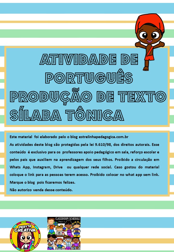 A Produção de texto de hoje é de um modo diferente. Resolvi fazer o desenvolvimento e a conclusão e deixar para as crianças fazerem a introdução e o título. O desenvolvimento é sobre o personagem muito conhecido pelo nosso Folclore o menino sapeca “SACI”.  Cada um já ouviu falar um pouquinho dele. Todos sabem como ele é, e das coisas que ele gosta de fazer, ou melhor das suas travessuras.  Fiz desse jeito para que as crianças possam contar um pouquinho do que elas sabem ou já ouviu falar. Além da produção de texto tem uma atividade sobre a sílaba tônica. Um conteúdo para ser trabalhado o ano inteiro e ainda haverá crianças sem entender como classifica-las. Tem muitas atividades sobre esse assunto. Você pode usar tanto como atividade de sal e de tarefa de casa.