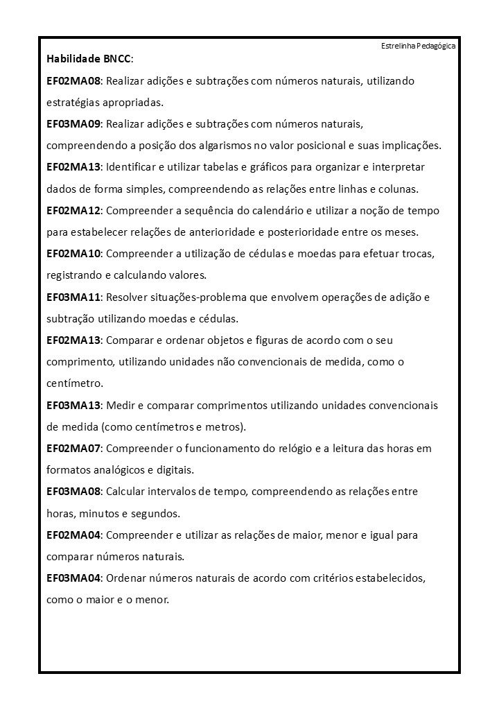 • EF03MA11: Resolver situações-problema que envolvem operações de adição e subtração utilizando moedas e cédulas.
